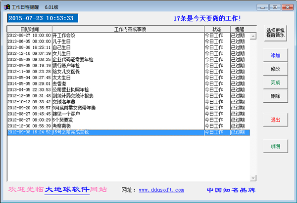 - 更新时间:2016-10-10 推荐指数: 文件类型:.iso大地球工作日程提醒系统是一款定时提醒工具,这款工具可以帮你记录每天要做的工作和事情,以免在忙碌起来的时候忘记一些重要的事情,你可以自行设置提醒的音量及音乐,使用非常方便...