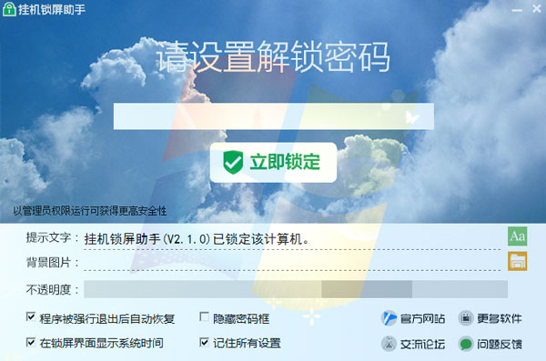 - 更新时间:2016-10-14 推荐指数: 文件类型:.iso挂机锁屏助手不仅可以轻松锁屏,保持计算机当前的运行状态,还可以自己设置密码、提示信息、透明度等等。软件十分轻巧,界面很好看,屏蔽了所有可用的系统快捷键。 更新日志 1.全新...