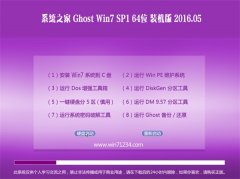- 更新时间:2016-05-07 推荐指数: 文件类型:.iso系统之家 GHOST WIN7 SP1 64位 装机版 2016.05 一、系统之家 主要更新 * 系统之家 更新DOS和PE下的分区工具DiskGenius为3.5版 * 系统之家 安装可在无人看管的情况下完成。装机任务...