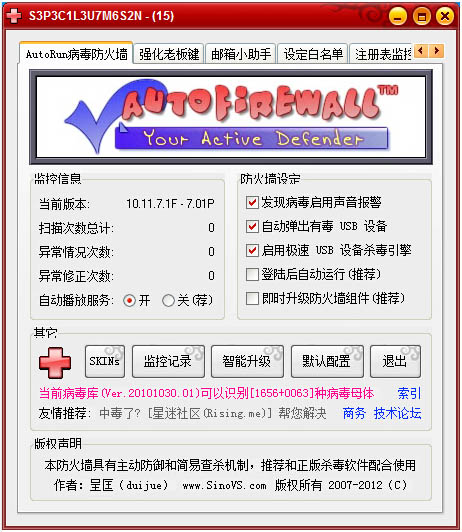 - 更新时间:2017-04-05 推荐指数: 文件类型:.isoAutoRun病毒防火墙(AutoFireWall)是一款集AutoRun病毒防火墙、注册表监控、强化老板键和邮箱小助手等功能于一体的多功能桌面工具,防火墙可以实时的监控您电脑上的AutoRun病毒,实...