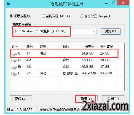 随后我们根据需要在映像文件路径下拉框中选择win10系统其中一个版本(这里,以win10系统专业版为例),接着在磁盘分区列表中选择C盘作为系统盘,然后点击“确定”按钮