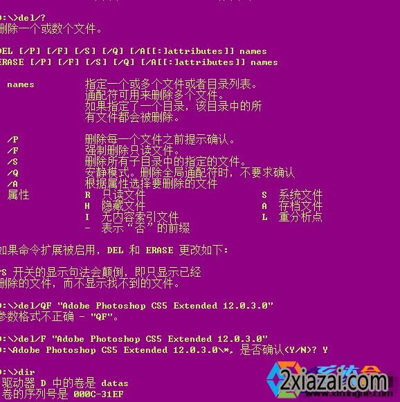 2、首先大家使用“CD 文件夹" 这样的命令来到需要删除文件的目录,然后先尝试使用最平常的DEL 命令来删除文件;