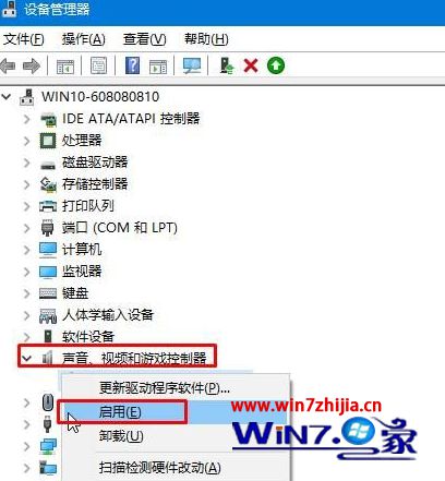 2、在设备管理器中展开“声音、视频和游戏控制器”,在下面的声卡上点击右键,选中“启用”,在跳出是不重启的框中打开是,重启计算机便可恢复正常。