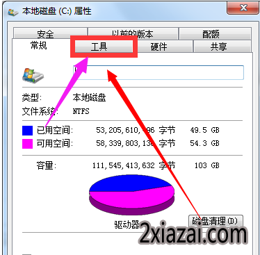 右键单击【我的电脑】,选中C盘,右键单击【属性】,在弹出的属性栏选择【工具】。