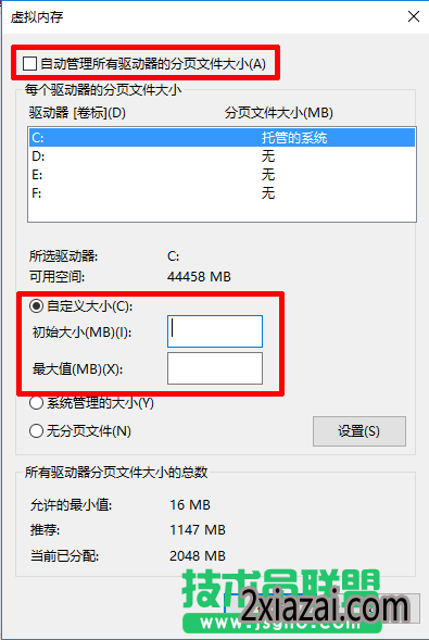 第二步:弹出窗口后点击设置进入性能选项,转到高级界面,点击更改,然后取消掉“自动管理所有驱动器的分页文件大小”,选择自定义大小,输入自己想要分配的数值保存即可。