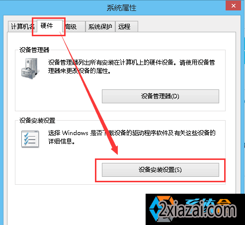 3、然后选中”系统属性“里的”硬件“选卡,然后打开“设备安装设置”;